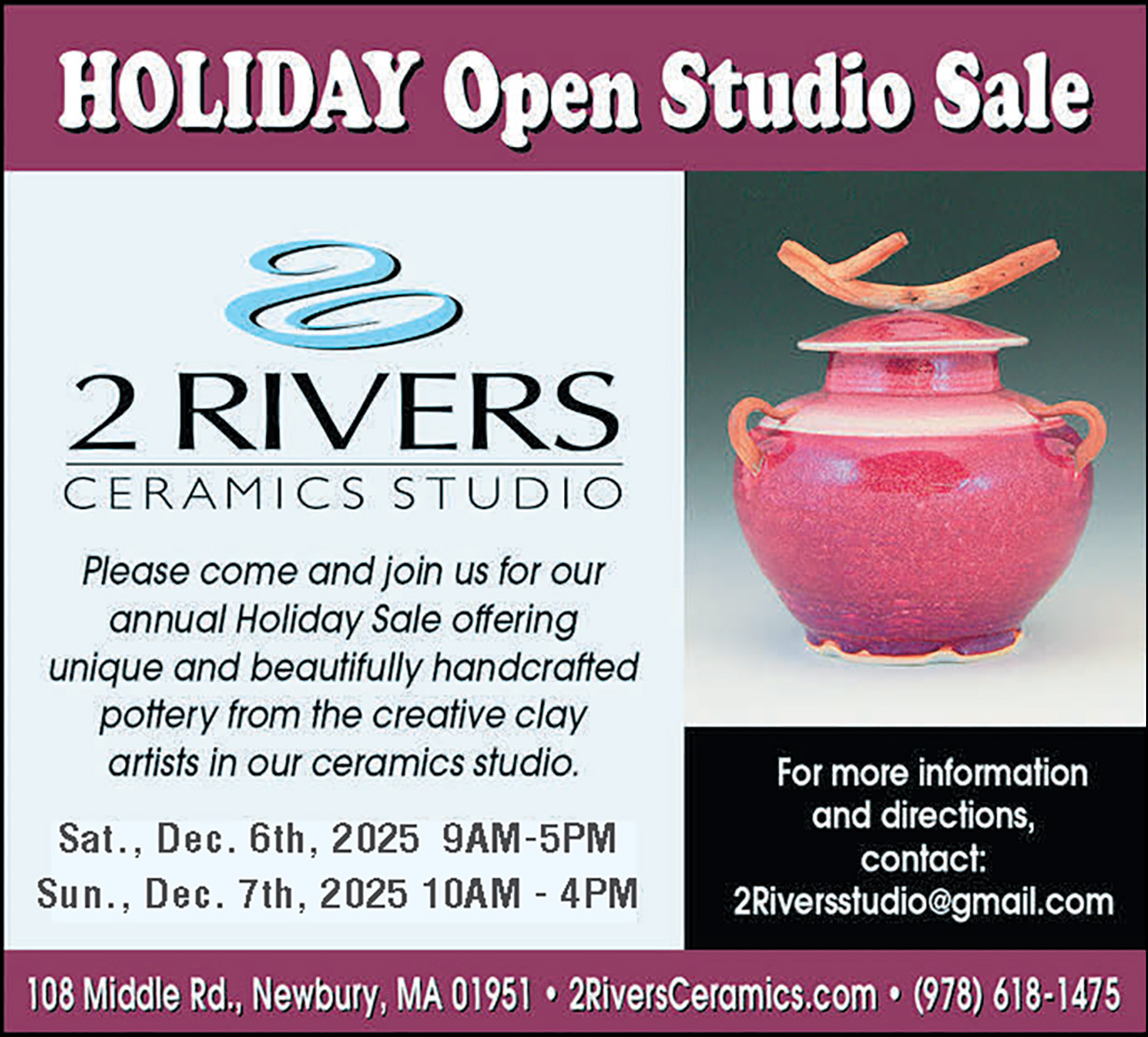 The 2 Rivers Ceramic Studio is a fully equipped, cooperative studio with facilities for the independent clay artist and beginner student. The goal of the studio is to provide a professional working atmosphere for ceramic artists of all abilities. A 40-cubic-foot, gas-fired reduction kiln is the centerpiece of the studio. There are day and evening classes for adult students wishing to pursue the clay arts at a variety of levels, from beginner to advanced. Located in Newbury just a short distance from Rt. 1 (Newburyport Turnpike), the studio is convenient to the North Shore and Merrimac Valley.